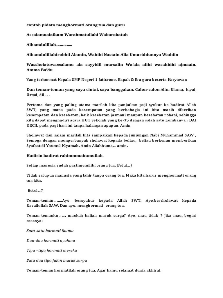 Lapor tapi karena berebut ingin mengasuh ibunda yang sudah tua renta itulah yang patut kita contoh. Berikut transkrip pidato dalam bahasa inggris dan indonesia tentang orang tua. Jadi wajib bagi kita semua untuk selalu berbakti kepada orang tua, dan guru kita dan selalu membahagiakan mereka, agar kita semua menjadi . Metode ekstemporan yaitu membuat catatan kecil berisi . Segala puji bagi allah yang menguasai seluruh .